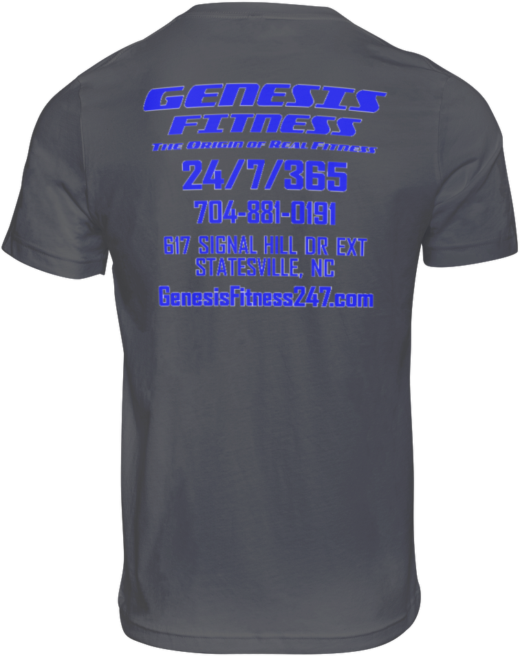 But that's not all – the back of the shirt provides valuable information about Genesis Fitness, including our mission to help individuals achieve their fitness goals, our state-of-the-art facilities, and our supportive and welcoming community. With this T-shirt, you not only represent Genesis Fitness, but also carry our commitment to health and wellness with you.